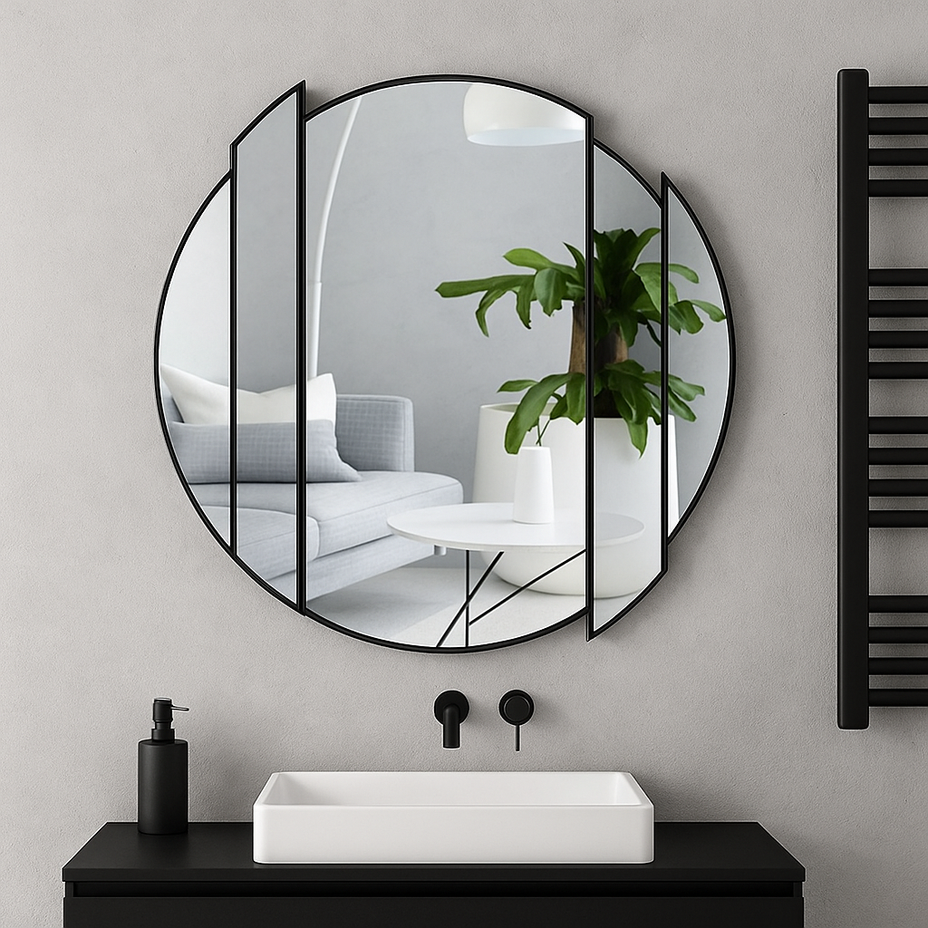 The mirror shown features clear mirror panels with a jet black trim, creating a beautifully crisp and reflective finish. For a more personalised look, we can craft your mirror using coloured glass, tinted mirrors, or a coloured trim in white, gold, or silver – simply let us know your preference.