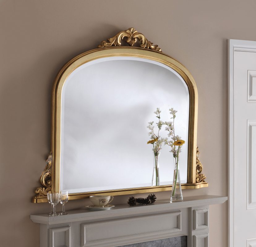 The Bernice Overmantle mirror features a central, bevelled mirror, framed with an ornate, frame available in gold. This mirror is a beautiful addition to any room and looks stunning over a fireplace.