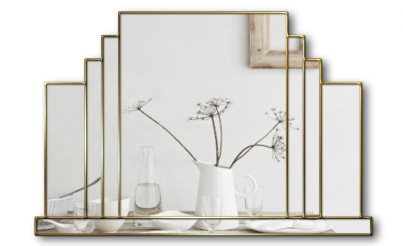 The large central shaped mirror is framed by 6 panels of flat, varying sized strips of mirror. Each section is framed with a gold trim, however it can also be finished with either an ebony or silver trim.