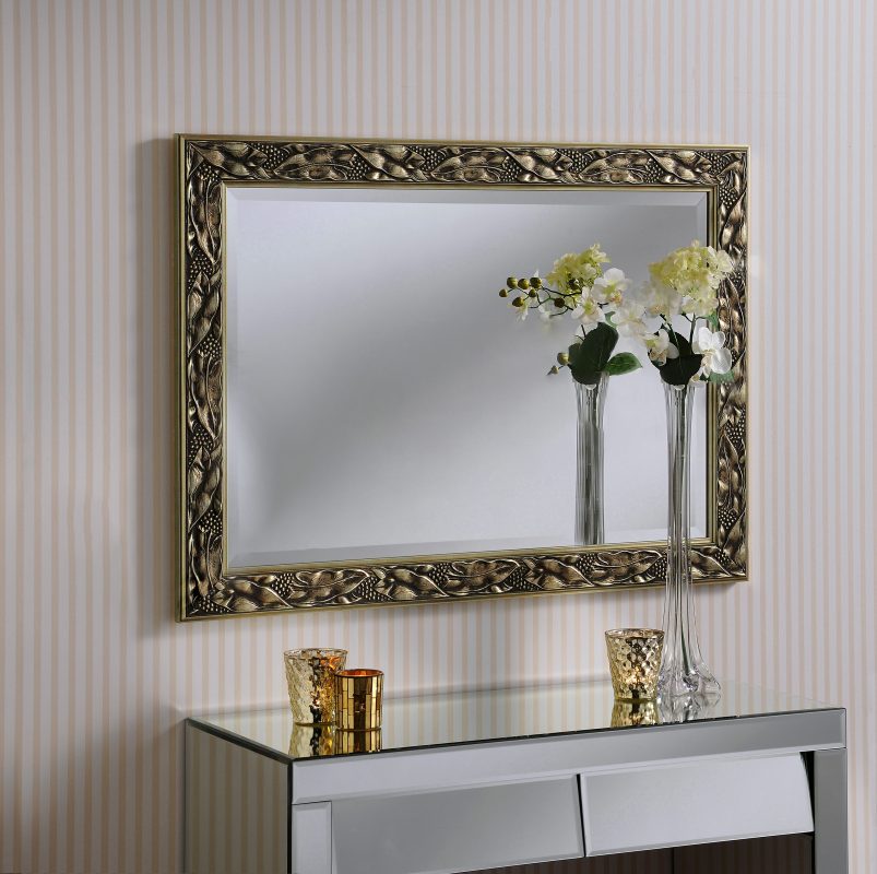 The mirror features a central, bevelled mirror, framed by a decorative, antiqued silver frame. The mirror can be hung portrait or landscape.